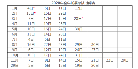 2020年全年托福考试时间