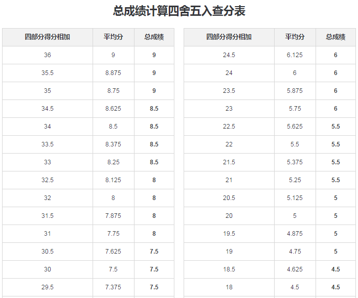 一看到这个标题,可能读者会觉得不可思议,觉得雅思9.0是不可能完成的任务。但是有一点必须要注意,雅思9.0并不意味着考生需要做到十全十美,不容许有一丝不完美。因为雅思的最后分数是由听、说、读、写四门的单科分数经过平均后四舍五入的成绩。雅思总分会以最接近的整分或者半分报告。为了避免疑惑,采用以下取整规定:如果平均成绩的小数位是.25,就四舍五入到下个半分档;如果平均成绩的小数位是.75,就四舍五入到下一整分档。通过观察下面这张雅思总成绩计算四舍五入查分表,可以很清楚地看到,总成绩9.0,最低平均分只需要达到8.75,也就是允许四门总共有1分的失分。